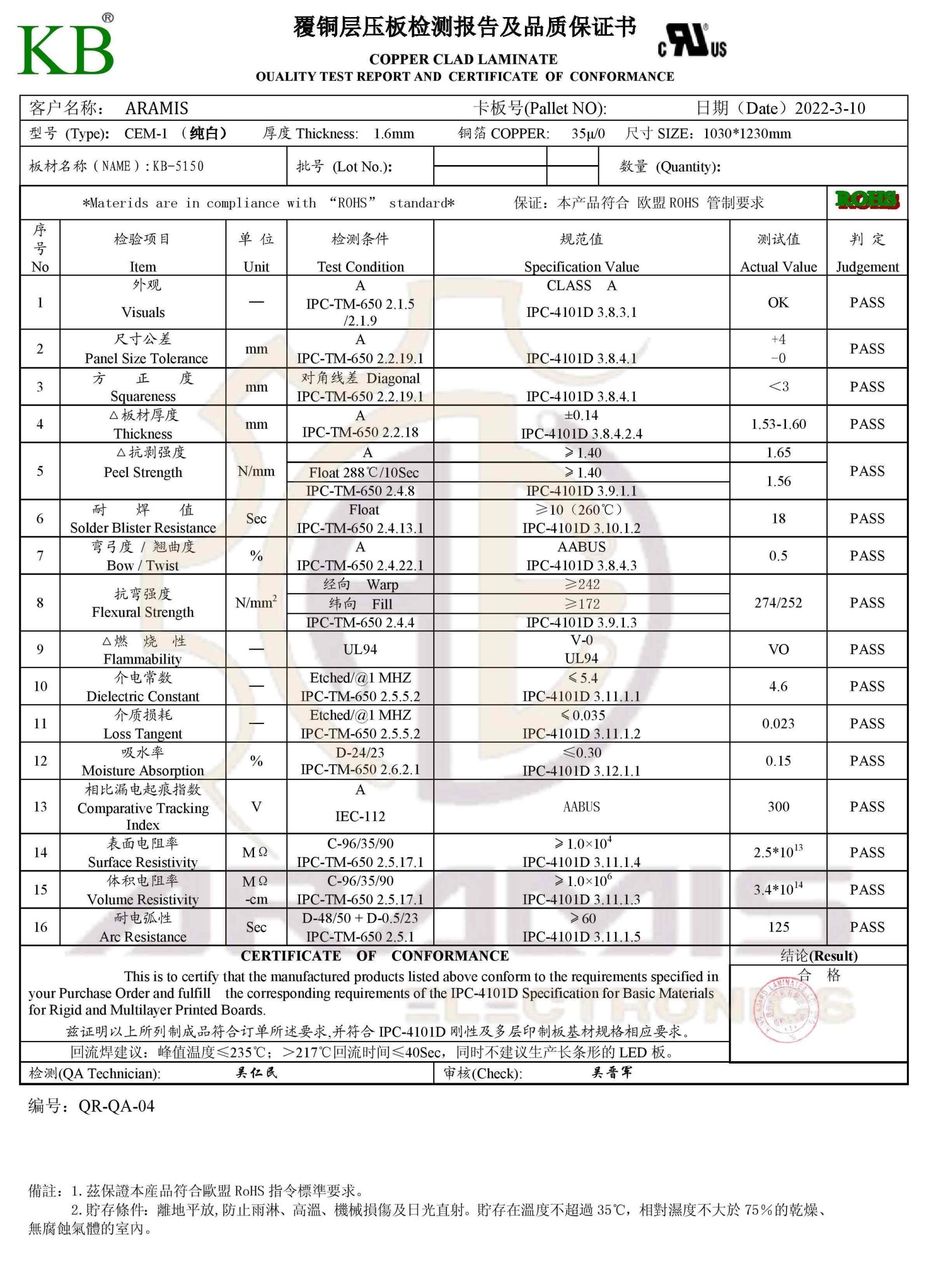35 میکرون (um)ابعاد استاندارد ورق CEM1: